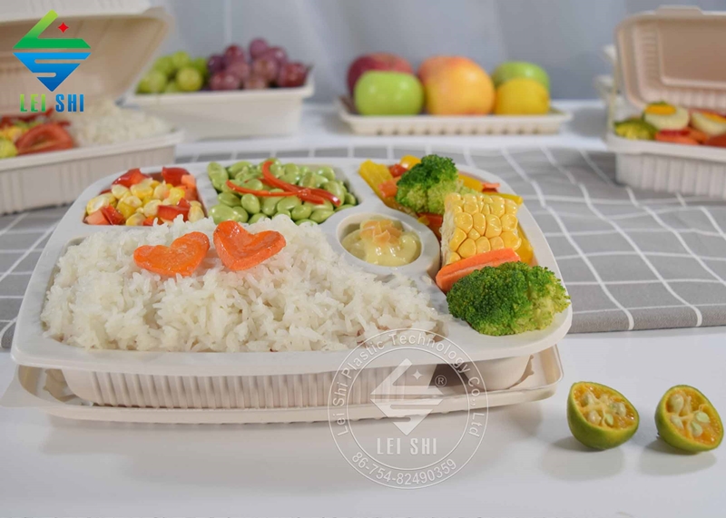 Degradable five-compartment lunch box. Serve full meals in convenient style compostable food containers. The biodegradable to-go containers makes a great choice for your daily meals or restaurants, food trucks, to-go orders, special events, and other types of food service environments.
